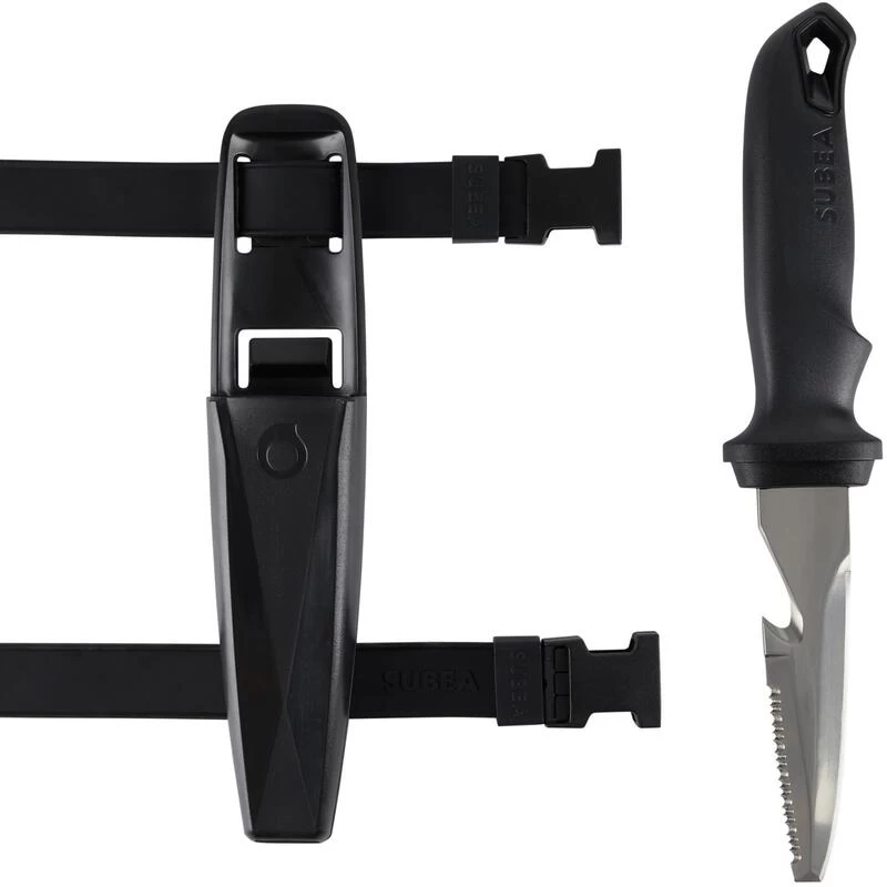 Les sangles sont en silicone : ce qui leur procure une meilleure accroche sur le néoprène notamment, évitant ainsi au couteau de bouger et de tourner sur le plongeur. Avec cette longueur de sangle, le couteau et son fourreau peuvent se fixer sur l’avant-bras, la cuisse, le mollet et même sur le Direct system du gilet stabilisateur. La fermeture de la sangle s’effectue avec des clips en matière plastique, pour plus de facilité et d’aisance pour fixer un couteau.
